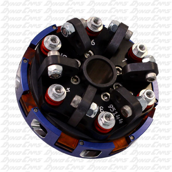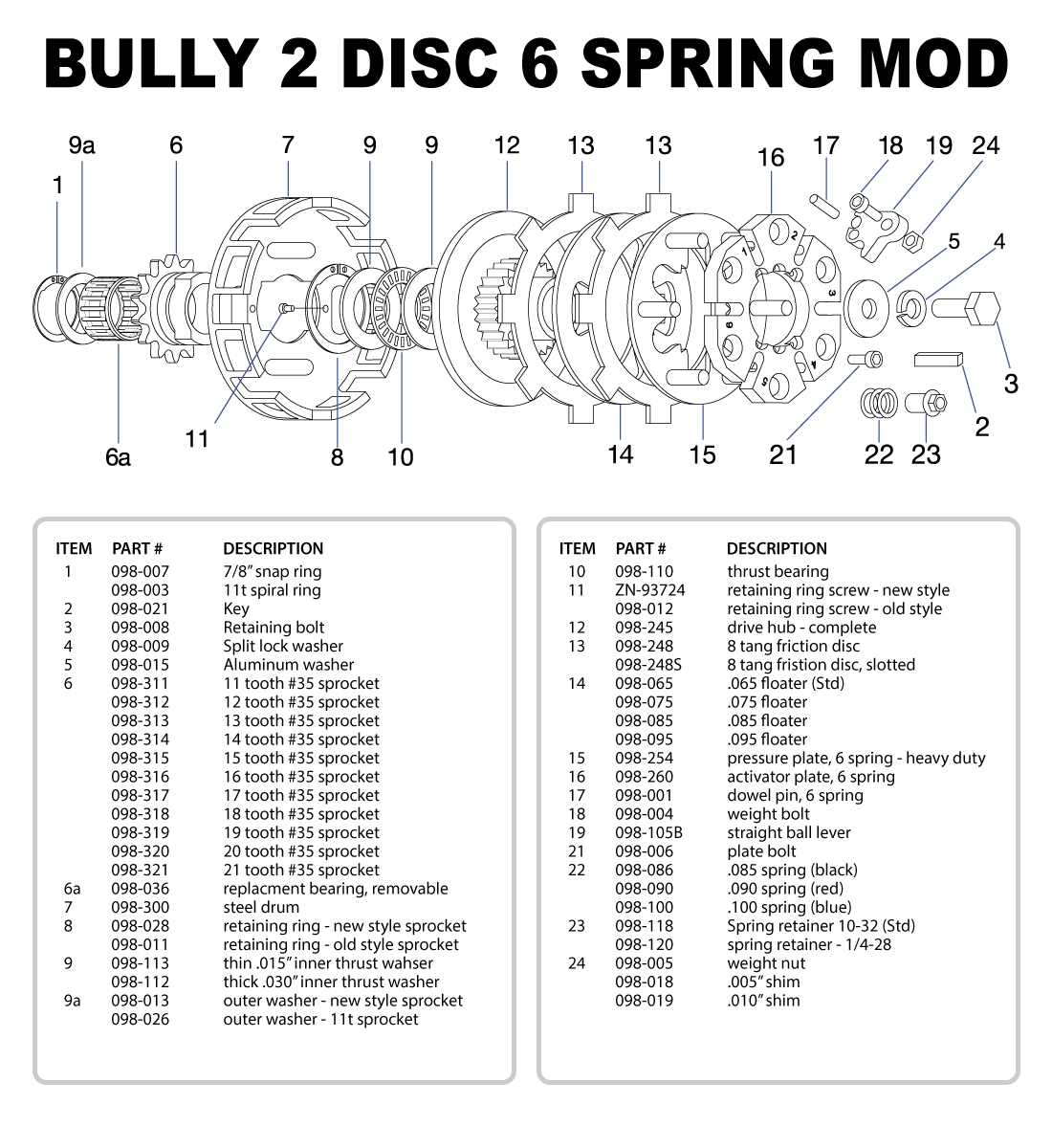 This is a 2 disc 6-spring clutch with ball levers. It is used in the Limited Briggs Flathead class on a track requiring very light clutch usage. Light clutch usage would be a result of either a light kart, or a track that is very large with wide, sweeping corners that do not require frequent clutch engagement. This clutch is set with anapproximate 4900 RPM engagement from the factory, but can easily be adjusted from 4900 RPM to 5700 RPM. This clutch is available in 11T-21T, and comes with a 098-300A aluminum basket.