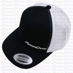This is a black trucker-style hat with a white mesh back and plastic snap. One size fits all.