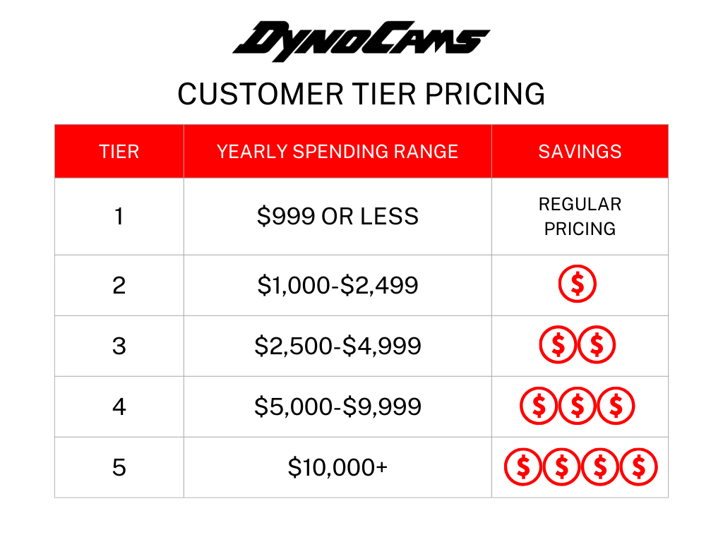 There are 5 savings tiers in the Customer Tier Pricing system. Tier 1 is for customers with an annual spending of less than $1,000. Upon reaching an annual spending range of $1,000-$2,499, customers earn Tier 2 status, unlocking savings on DynoCams products. Tier 3 is designated for customers with an annual spending range of $2,500-$4,999, allowing additional savings. Customers who advance to Tier 4 will further increase savings when they reach an annual spending of $5,000-$9,999. When customers achieve yearly spending of $10,000 or more, they reach the highest level of savings available to DynoCams customers.